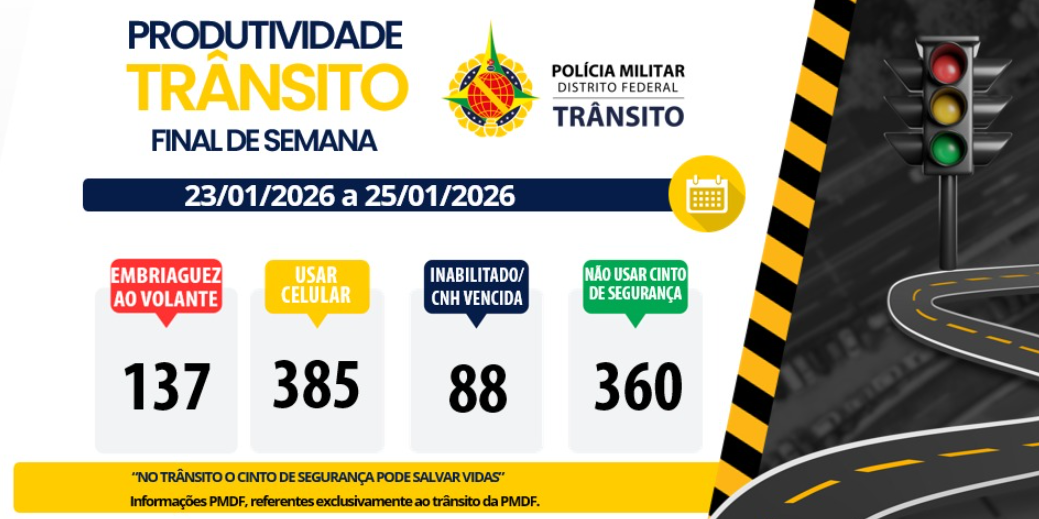 Entre os dias 23 e 25 de janeiro, a Polícia Militar do Distrito Federal (PMDF) intensificou as ações de fiscalização em diversas regiões, com foco na proteção da vida, na prevenção de acidentes, na redução de comportamentos de risco nas vias e na promoção de maior fluidez do trânsito. As equipes registraram 137 autuações por embriaguez ao volante, 385 por uso de celular ao dirigir, 88 por condução sem habilitação ou com CNH vencida e 360 por não utilização do cinto de segurança.